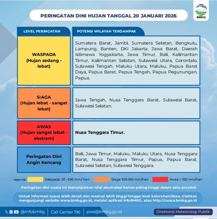 Dalam keterangan tersebut, rata-rata seluruh daerah di Indonesia mendapatkan curah hujan sedang hingga lebat ekstrim, terutama untuk wilayah Nusa Tenggara Timur, termasuk prediksi terjadinya angin kencang.