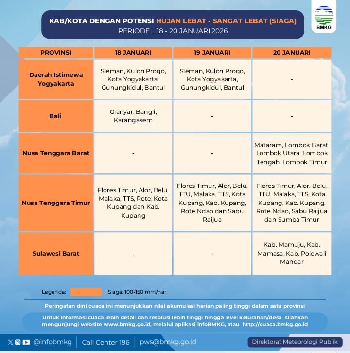 Untuk wilayah Nusa Tenggara Barat, dalam rentang tiga hari ini diduga akan mengalami hujan intensitas sedang hingga lebat pada tanggal 18 dan 19 Januari.